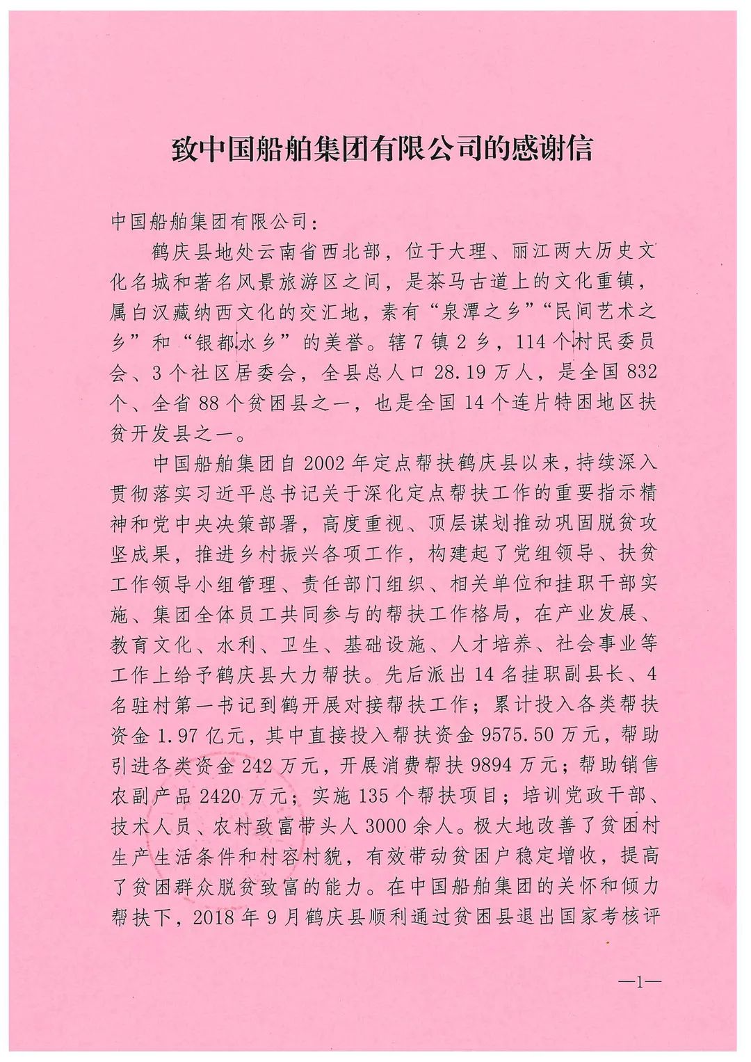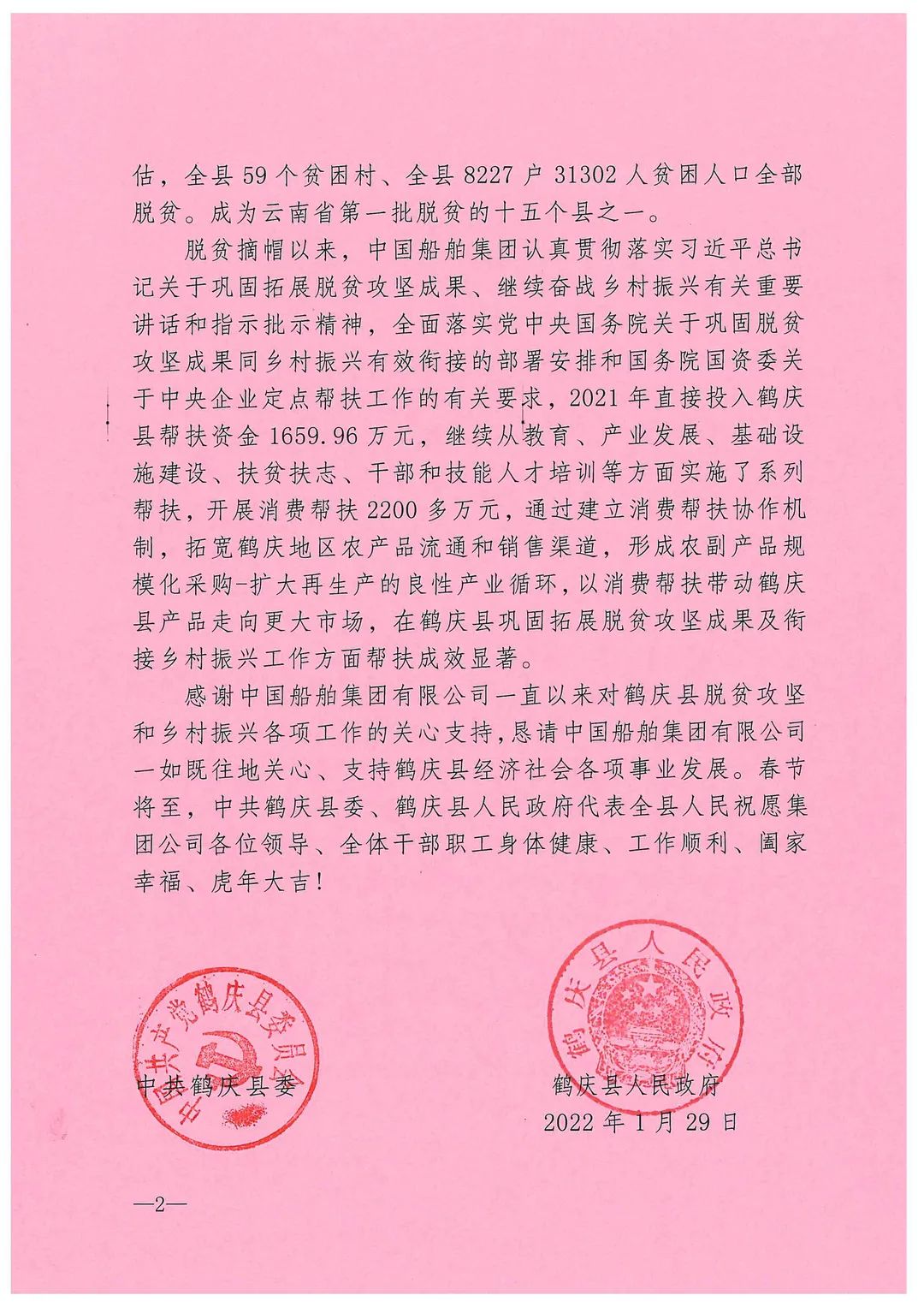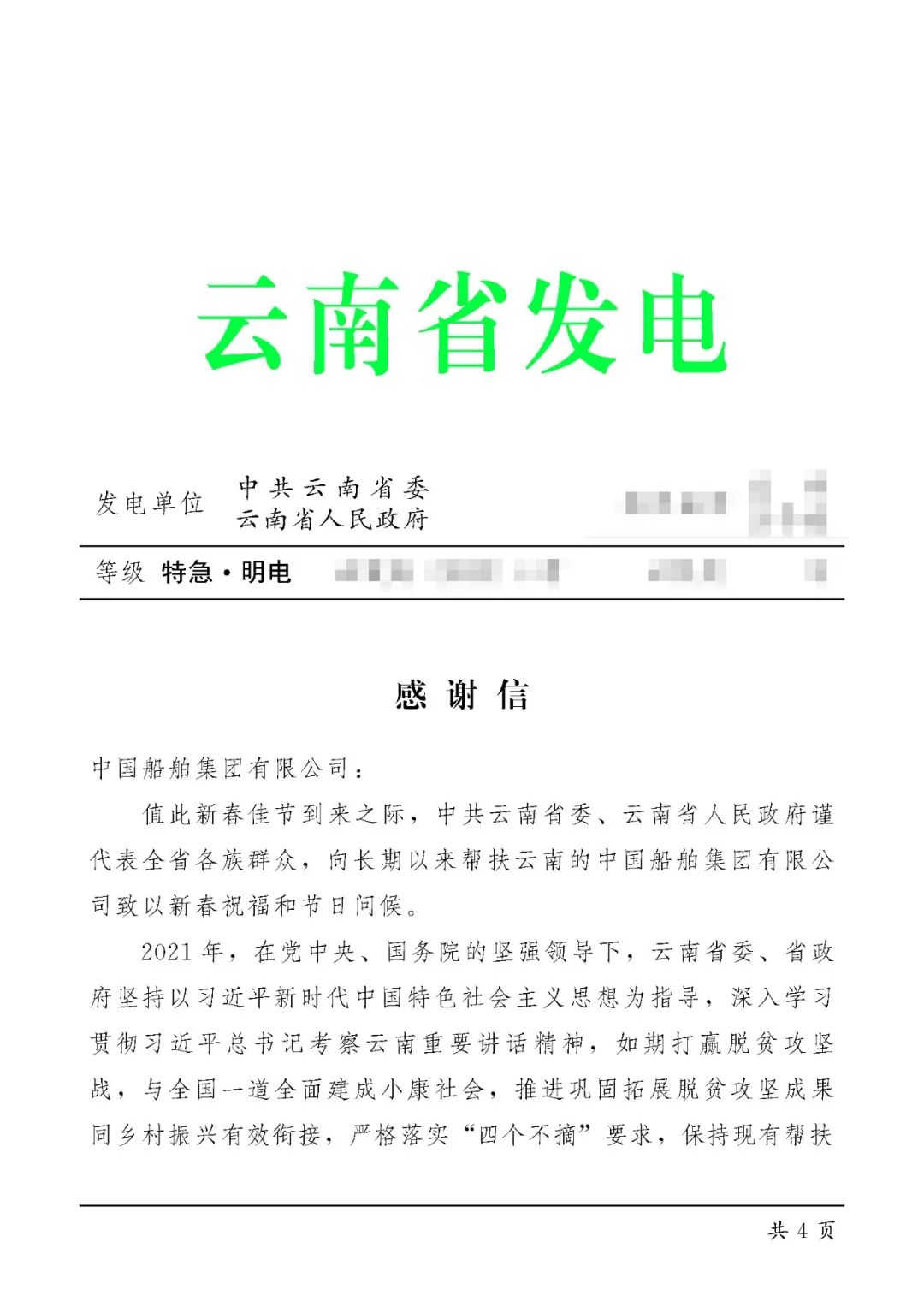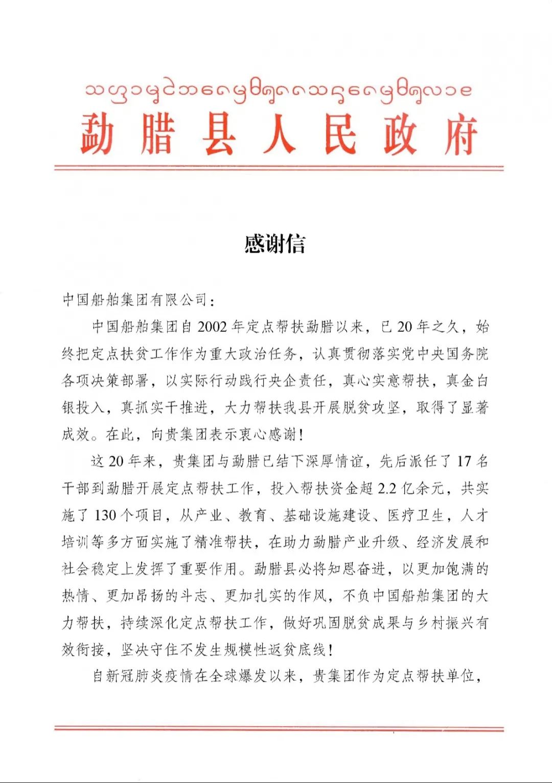 春節前夕,中國船舶集團陸續收到云南省委省政府、文山州委州政府、鶴慶縣委縣政府、勐臘縣政府發來的感謝信,對集團公司長期以來給予鶴慶縣、勐臘縣、丘北縣的傾力幫扶表示衷心感謝和崇高敬意。