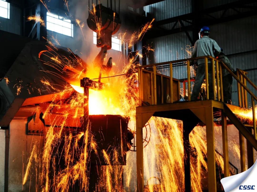 這是在中國船柴宜柴公司鑄造車間拍攝的一幅爐前工正在出鐵水的照片,1300多攝氏度的鐵水出爐時,整幅畫面十分紅火、大氣。展現了爐前工在60多攝氏度的爐前高溫下作業的工作場面。