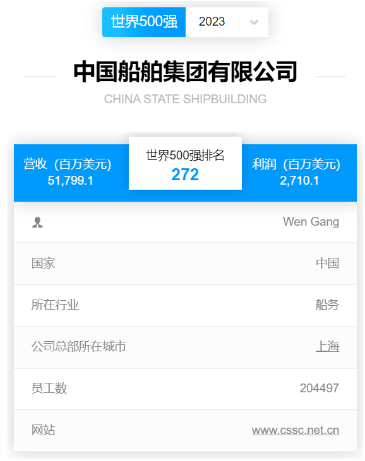 北京時間2023年8月2日,《財(cái)富》中英文網(wǎng)站同時發(fā)布2023《財(cái)富》世界500強(qiáng)排行榜,中國船舶集團(tuán)有限公司以517.991億美元的營業(yè)收入位列全球榜單第272位,自2021年重組后首次申報以來連續(xù)三年上榜,蟬聯(lián)全球造船企業(yè)首位。