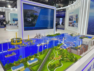 #  10萬噸級大型深遠海養殖工船、2000噸自升自航式風電安裝平臺、耕海一號二期工程等模型以及“藍色海洋經濟綜合體”沙盤,生動展示出“深海養殖+海上文旅+海上風電”互聯互通的繁榮業態景象;