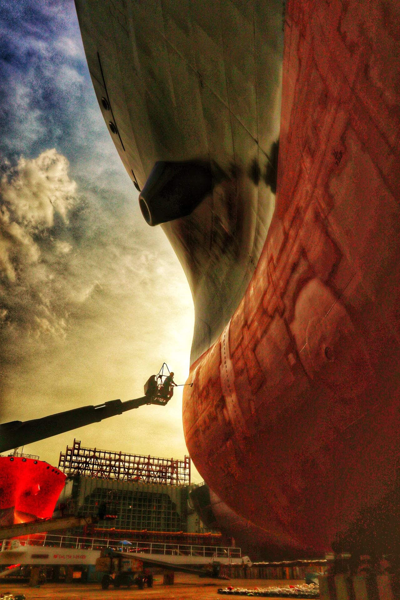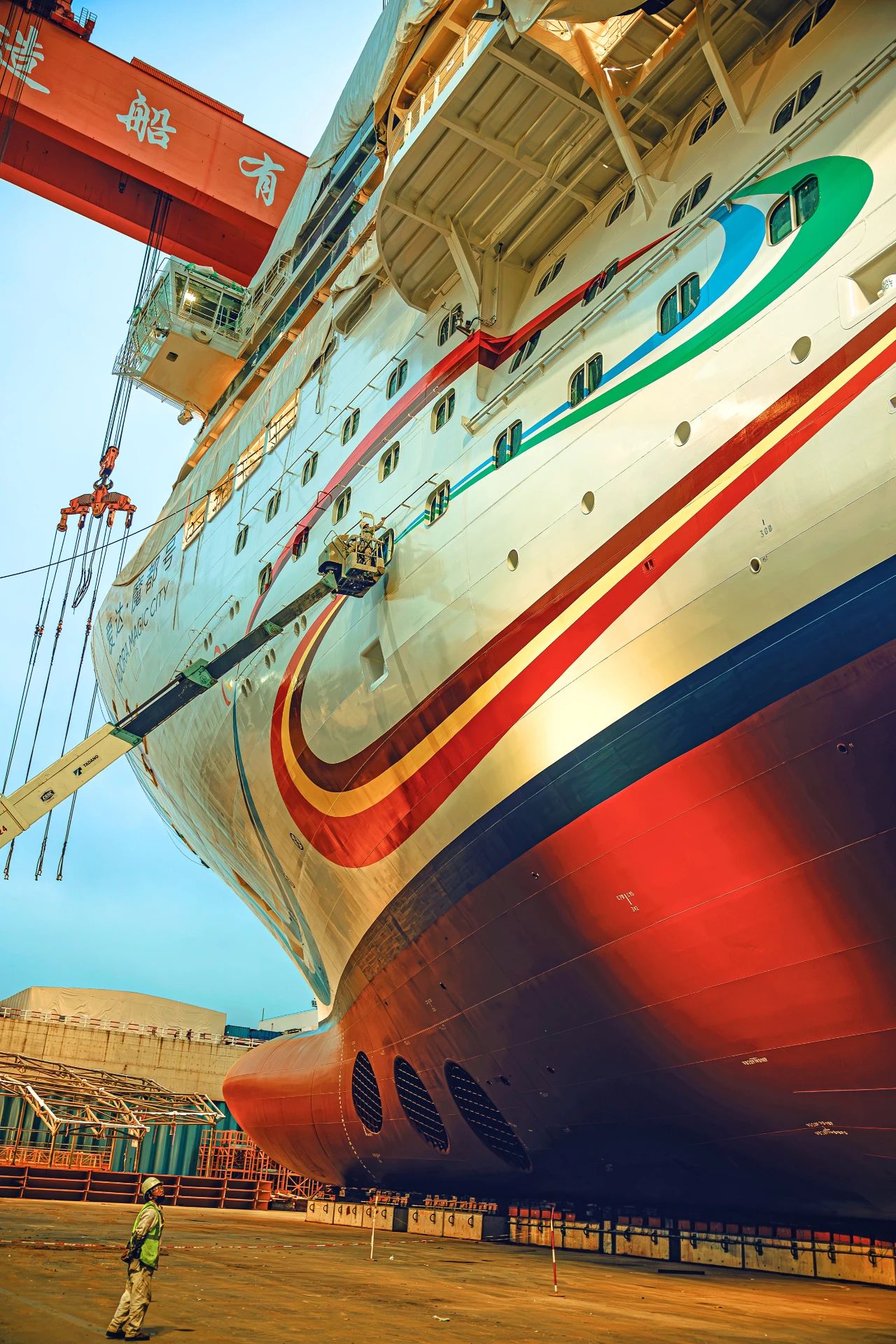 照片攝于國(guó)產(chǎn)首艘大型郵輪首次出塢前夕,拍攝時(shí)期為傍晚,船塢開(kāi)啟燈光照明,工人在對(duì)船身做最后的涂裝修飾工作。這樣的角度觀看國(guó)產(chǎn)首艘大型郵輪令人無(wú)比震撼。