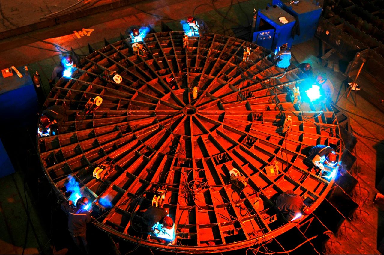 該作品反映的是造船工人在車間里焊接分段的場(chǎng)面。為了保證焊接件不受熱脹冷縮的影響而變形,需要十幾個(gè)工人從不同角度同時(shí)不間斷焊接,有時(shí)連續(xù)工作十幾個(gè)小時(shí),直至焊接件全部完成。在這不是戰(zhàn)場(chǎng)勝似戰(zhàn)場(chǎng)的車間里,每一名工人都在聚精會(huì)神地激戰(zhàn)著。