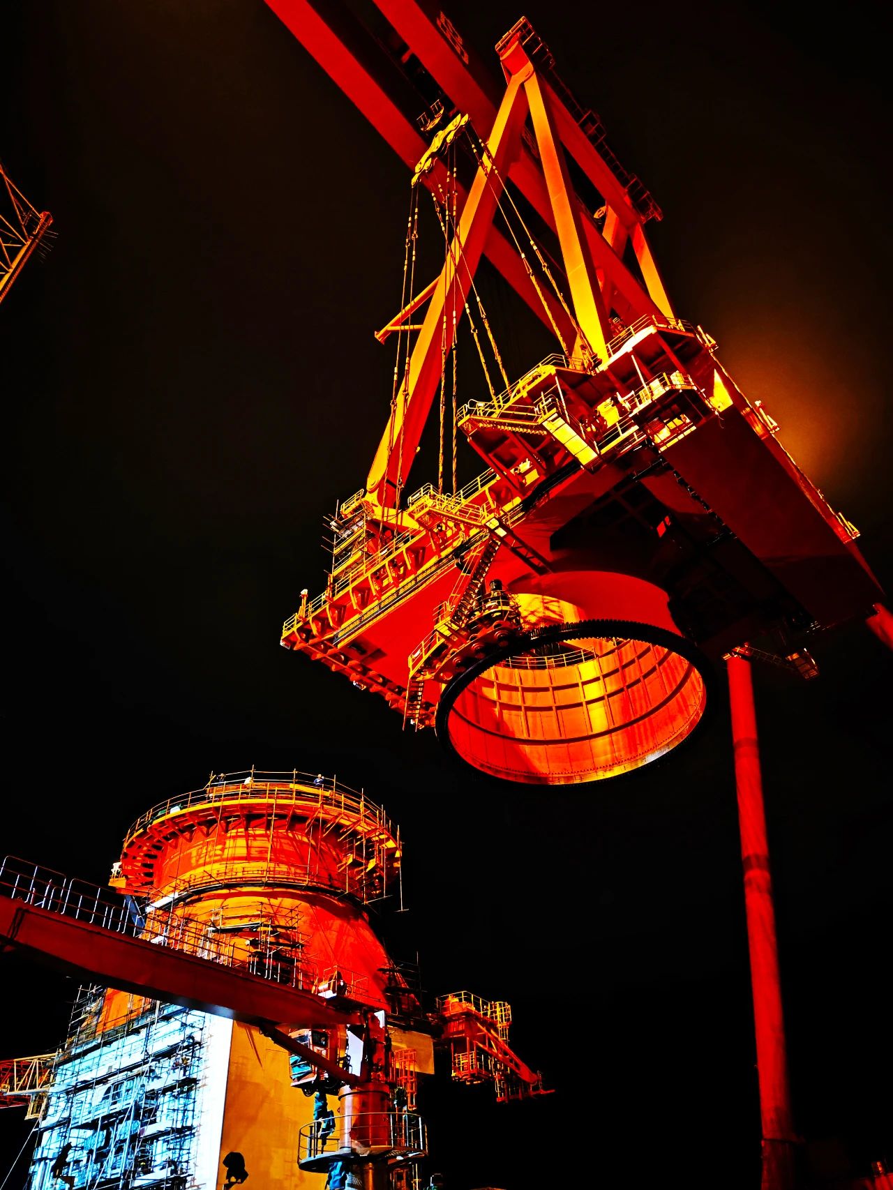 在武漢船機(jī)平臺(tái)總裝現(xiàn)場(chǎng),華夏金租神大平臺(tái)配套的1200噸起重機(jī)正在安裝,大件吊裝各項(xiàng)準(zhǔn)備工作繁瑣,一切就緒時(shí),天已經(jīng)黑了,現(xiàn)場(chǎng)一鼓作氣開(kāi)始吊裝對(duì)接,展現(xiàn)了船舶人只爭(zhēng)朝夕、不負(fù)韶華、忘我工作精神風(fēng)貌。