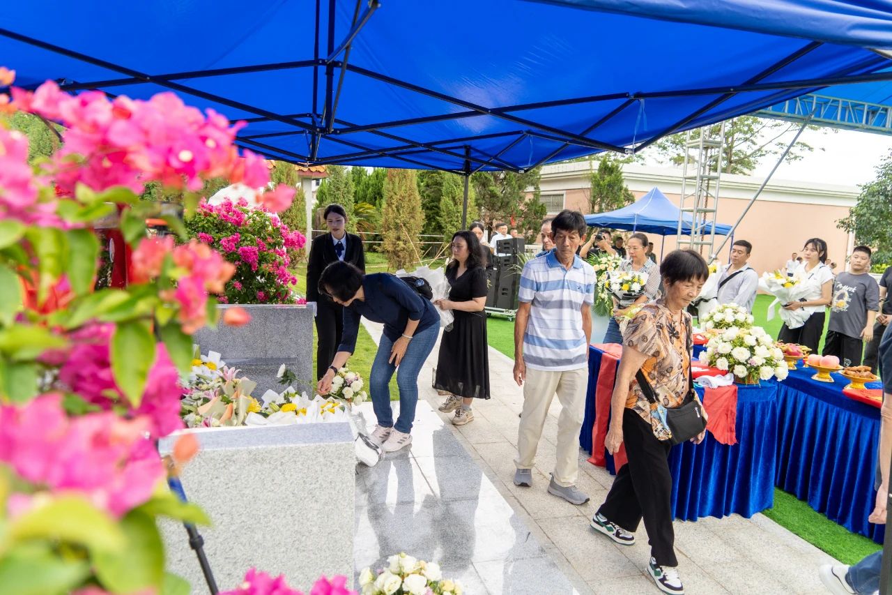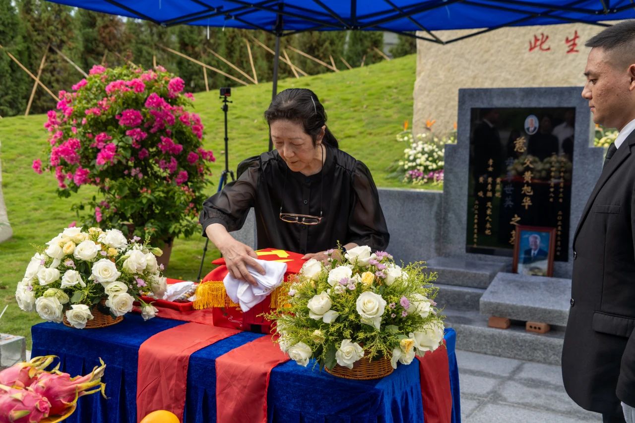 10時,骨灰安放儀式正式開始。親屬代表擦拭墓碑后,在禮賓人員的引導(dǎo)下將黃旭華院士的骨灰安放進(jìn)墓穴。參加儀式的人員向黃旭華院士墓碑行三鞠躬禮,并敬獻(xiàn)鮮花。眾人以簡約但莊重的儀式,送別這位為我國核潛艇事業(yè)默默奉獻(xiàn)一生的國之脊梁。