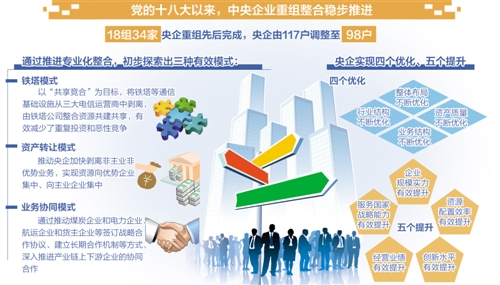 黨的十八大以來,中央企業(yè)的重組整合,成為國企改革的重要內(nèi)容。5年來,中央企業(yè)的重組整合穩(wěn)步推進,國務(wù)院國資委先后完成18組34家央企重組,央企由117戶調(diào)整至98戶。