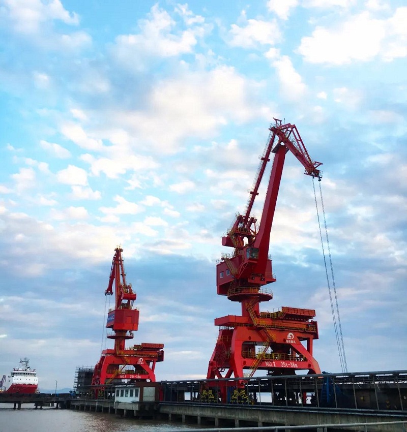 ????近日,武漢船機海西重機為寧波舟山港老塘山碼頭打造的2臺25T-36M四連桿帶斗門機順利交付。門機額定起重量25噸,工作幅度36米,額定工作效率800噸/時,主要用于煤炭和海沙的卸船作業。