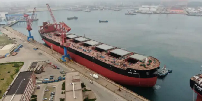 ????6月6日上午,外高橋造船為山東海運(yùn)建造的18萬(wàn)噸散貨船H1494船順利出塢。
