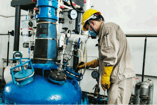 在原料藥車間,七一六所杰瑞藥業(yè)員工細心查看反應釜內物料反應情況。此時釜內溫度高達124.8℃,近身溫度超過50℃,全程反應時間約3~4小時。