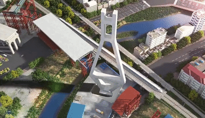由于龍巖大橋主塔采用了扁平的“寶石”型設計,主塔側面距鐵路的最近距離不足6.5米,為保障施工安全,需要在“塔梁共轉”的常規轉體施工前,對橋梁主塔首先進行一次“獨塔單轉”。即將主塔在距鐵路20米左右的距離進行施工,建設完成后,首先進行單獨的主塔轉體,主塔到位后再進行橋面梁體架設施工,待橋面梁體全部安裝完成后,主塔和橋面再整體進行第二次轉體。