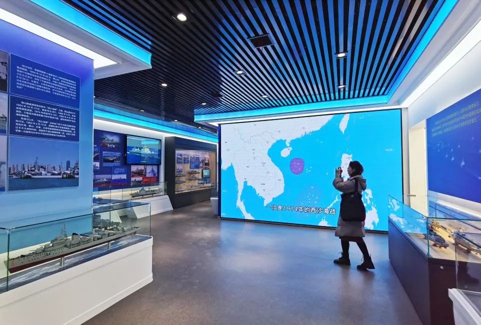 由中國船舶七一四所設(shè)計施工的艦船打卡地,有著10米長的大型長沙艦?zāi)P停剡_8.75噸的船錨昂首挺立,45艘包括航母、核潛艇、驅(qū)逐艦、護衛(wèi)艦在內(nèi)的各型艦船武器模型,200多幅圖片文字,為觀眾展示了近代以來海軍裝備波瀾壯闊的發(fā)展歷程。
