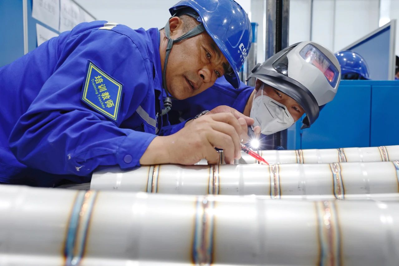 大連造船——LNG綜合培訓(xùn)中心,施工人員正在進(jìn)行貨物圍護(hù)系統(tǒng)粘連作業(yè)和焊接作業(yè)培訓(xùn)。