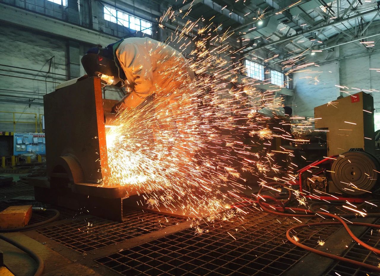 武漢船機(jī)——鋼構(gòu)制造部員工穿著厚厚的防護(hù)服進(jìn)行焊接工作。
