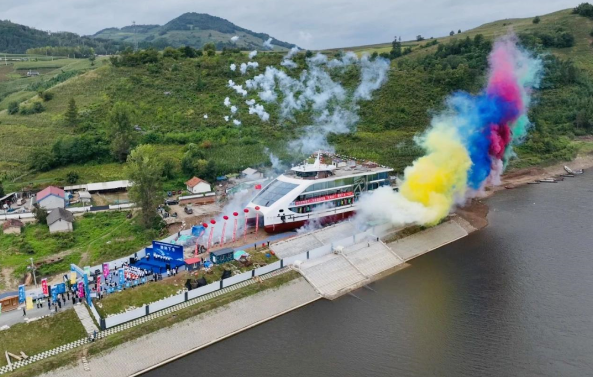 日前,中國船舶集團(tuán)七一二所提供整船動(dòng)力系統(tǒng)的新能源游覽船“天河一號”,在吉林省靖宇縣順利下水。“天河一號”下水現(xiàn)場。該船總長58米,定員乘客600人,搭載七一二所柴油發(fā)電機(jī)組。在經(jīng)濟(jì)航速下,純電續(xù)航能力超過4個(gè)小時(shí)。