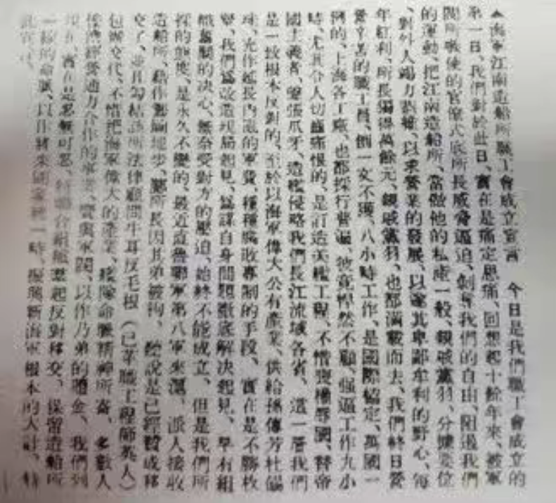 1927年3月21日,上海工人舉行第三次武裝起義,起義勝利后的第二天,在楊培生組織下,江南造船所職工會(huì)成立,并發(fā)布《職工會(huì)宣言》,揭露軍閥與官僚的反動(dòng)面目,喚醒工人奮起斗爭。