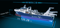 ????“深藍號”由黃埔文沖建造,七〇八所參與設計,總長約120米,型寬21.6米,設計吃水7.3米,設計航速15節,主機功率8000 千瓦,載重噸約5000噸。“深藍號”是我國自主研制建造的第一艘漁業捕撈加工一體船,也是目前最大最先進的漁業捕撈加工一體船,取得近200項知識產權保護,實現了我國現代化漁業船舶裝備領域的重大突破,達到世界先進水平;主要用于南大洋漁業捕撈,兼顧海洋科考功能,可滿足ICE-A冰區(冰厚度0.8米)及-25℃低溫環境的營運要求。