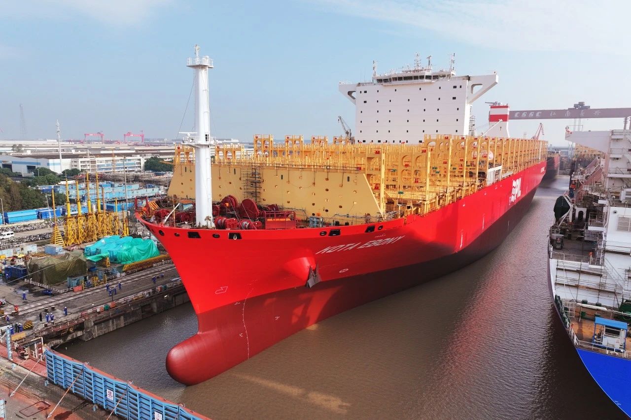 同步起浮的2艘半船是為新加坡太平船務(PIL)建造的14000TEU LNG雙燃料集裝箱船系列船第四艘的艏、艉半船。為了更好地進行船舶浮態(tài)對中,減少變形量,建造團隊開創(chuàng)了新的起浮方案,為后續(xù)集裝箱船樹立了半船起浮的新模式。