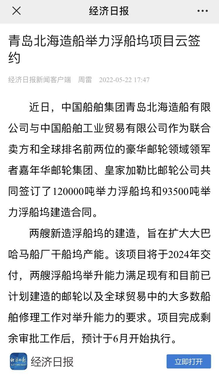 日前,中國(guó)船舶集團(tuán)旗下北海造船與中船貿(mào)易作為聯(lián)合賣(mài)方,與嘉年華郵輪集團(tuán)、皇家加勒比郵輪公司共同簽訂了1艘12萬(wàn)噸舉力浮船塢和1艘9.35萬(wàn)噸舉力浮船塢建造合同。中國(guó)船舶集團(tuán)黨組書(shū)記、董事長(zhǎng)雷凡培,黨組成員、副總經(jīng)理孫偉,嘉年華集團(tuán)總裁兼首席執(zhí)行官阿諾德·唐納德,皇家加勒比集團(tuán)總裁兼首席執(zhí)行官杰森·利伯特共同見(jiàn)證此次“云”簽約。