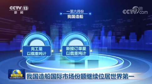 7月17日,央視《新聞聯(lián)播》對我國造船國際市場份額繼續(xù)位居世界第一進行了報道。數(shù)據(jù)顯示,一至六月份,我國造船完工量、新接訂單量、手持訂單量,以載重噸計分別占世界總量的45.2%、50.8%和47.8%,國際市場份額繼續(xù)位居世界第一。