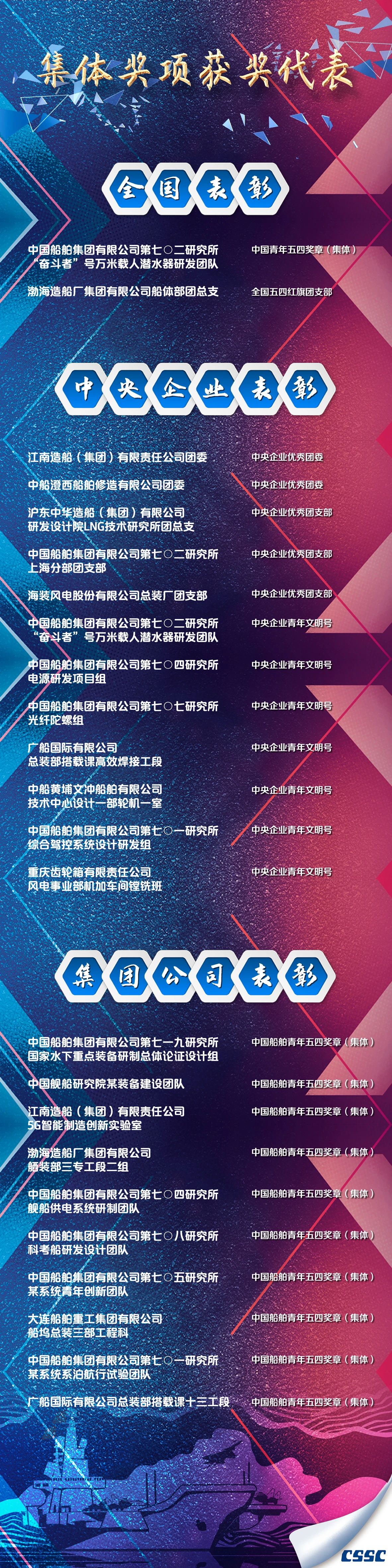 中國船舶集團各級團組織和廣大團員青年、團干部在高質量發展、脫貧攻堅、疫情防控的主戰場,奮勇當先、無私奉獻、勇立潮頭、勇挑重擔,把青春旗幟插在了決勝的高地,涌現出一批勇擔時代使命、引領時代之風的先進青年個人和先進青年集體。