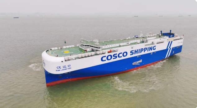 4月21日,中船集團旗下廣船國際聯合中船貿易建造的7000車液化天然氣(LNG)雙燃料動力汽車運輸船“漢江口”號舉行命名交船儀式。據了解,該船交付后,首航次將從上海裝載國產汽車奔赴智利、秘魯、危地馬拉等國家。